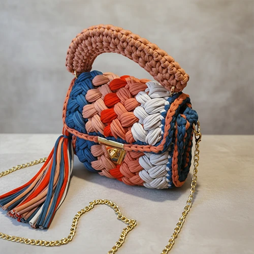 Handmade crochet mini bag with bold candy colours chunky texture and playful charm.