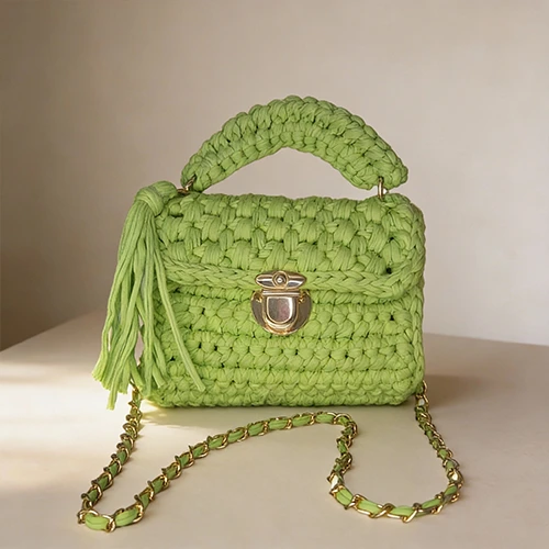 Handmade crochet mini bag in vibrant green tones with tassel detail top handle and chain strap. Bold playful and full of energy.