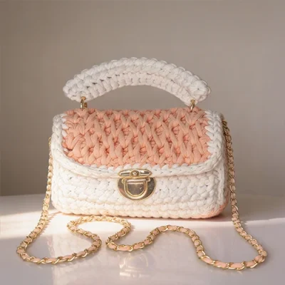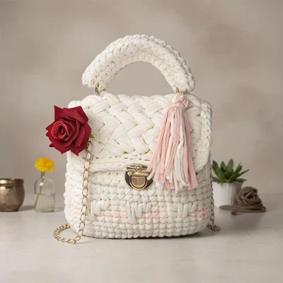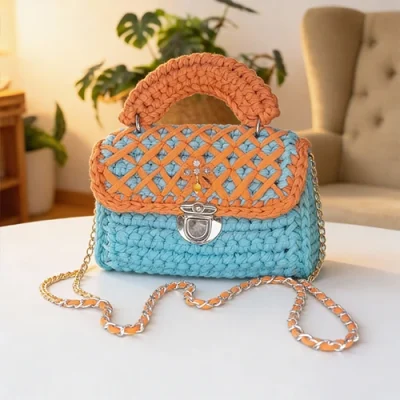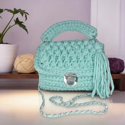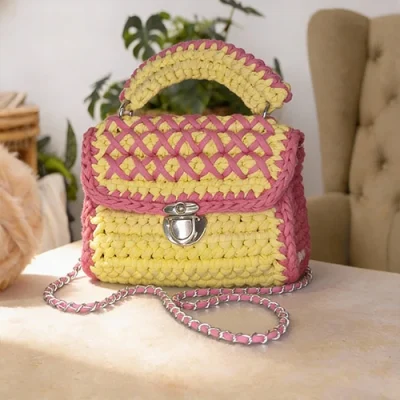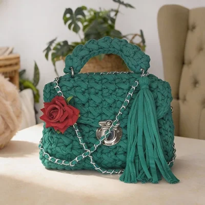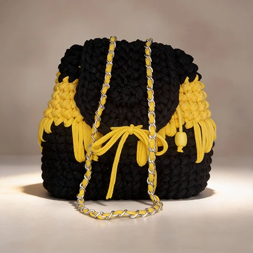 Handmade crochet purse in deep black with vibrant yellow fringe details and a playful chain strap. Bold fun and perfect for adding personality to any outfit.